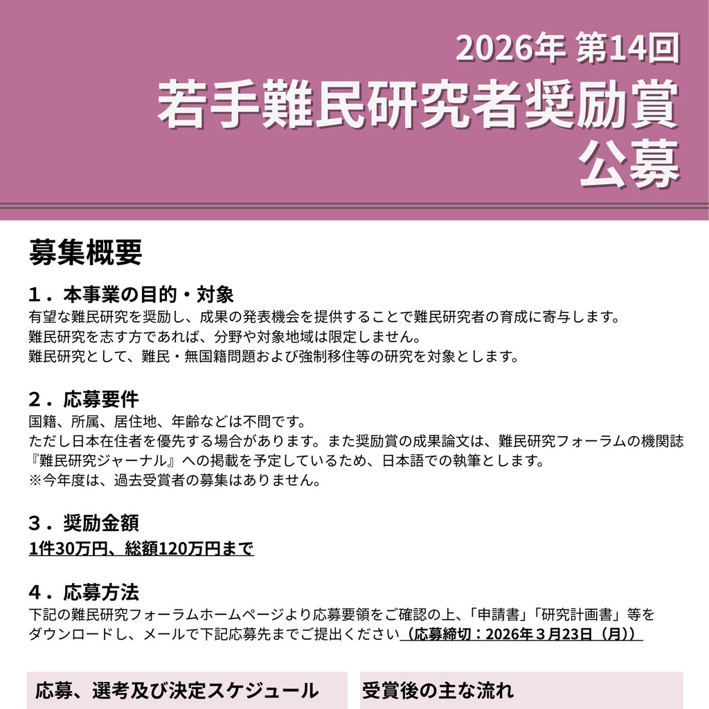 ◇2026年・第14回「若手難民研究者奨励賞」公募受付中!