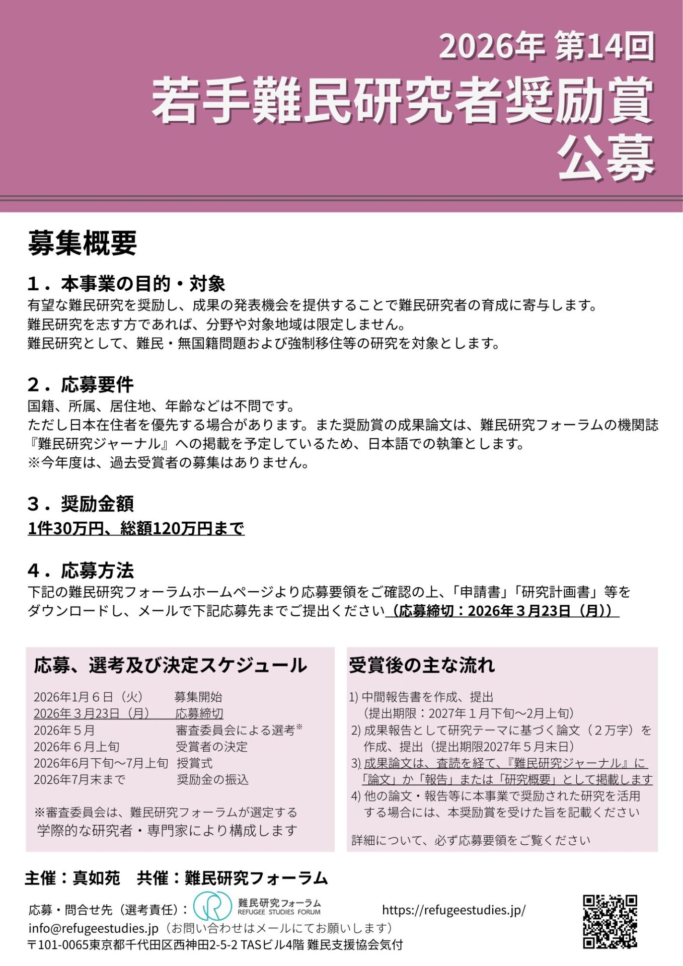 2026年第14回若手難民研究者奨励賞の公募を開始いたしました。